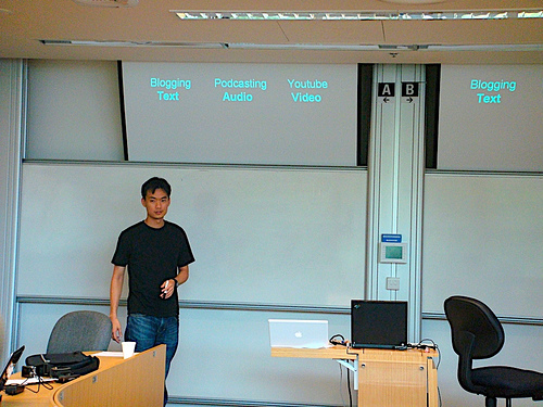 In my last post “Blogging, Podcasting, or Youtube? Choosing the right medium” – Podcamp Singapore, I talked about my experience as a speaker at Podcamp Singapore. For a long time, I wanted to try out a different way of using PowerPoint – using both the whiteboard and PowerPoint concurrently without having to move the projection screen up and down – and Podcamp was a great opportunity to do that.